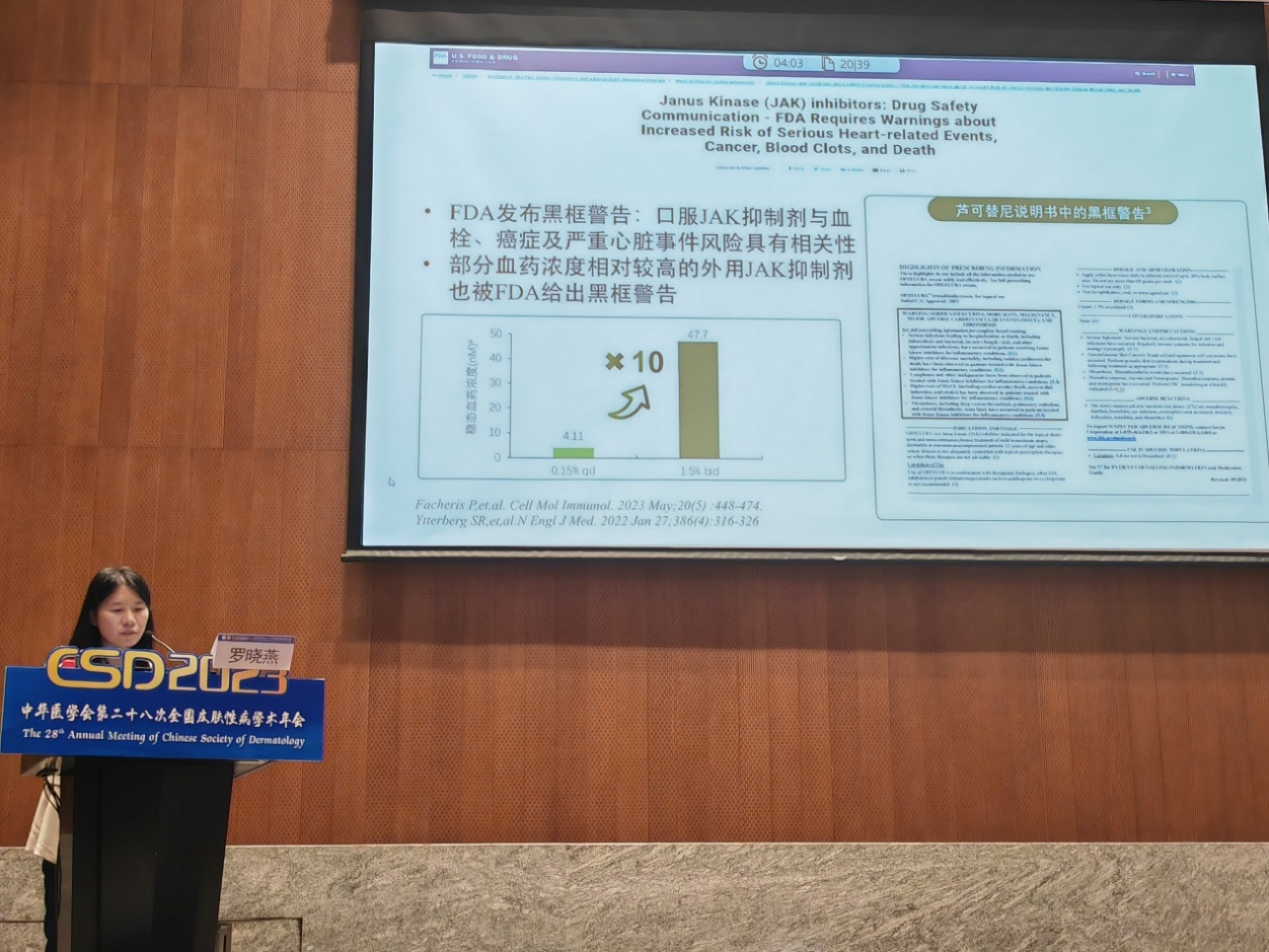 同时,罗教授在报告中提到口服JAK抑制剂及部分透皮入血浓度较高的外用JAK抑制剂可能出现的潜在严重不良反应,包括贫血、感染、血脂代谢异常、肿瘤等,被FDA给予黑框警告,应引起国内外临床皮肤科医生的关注。