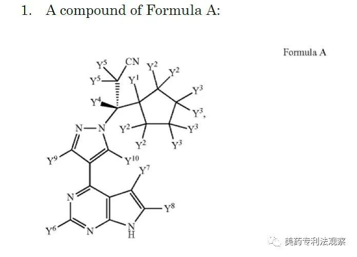 149专利针对的是ruxolitinib的氘代化合物,特别包括Sun Pharma 的CTP-543亦称为deurolitinib用于治疗斑秃脱发的产品。该产品由Concert开发,目前处于FDA评审阶段,FDA已授予此申请突破性疗法和快速通道的资格,可谓一明星产品。2023年1月Sun花费5.76亿美元收购了Concert及CTP-543。氘代是指化合物中部分或全部氢原子被同位素氘取代,这种取代可能改变一个药品分子的药代动力学如吸收,代谢等的特性。149 专利的权利要求1针对的是如下的氘代化合物结构(Y2-Y10均可为氘):