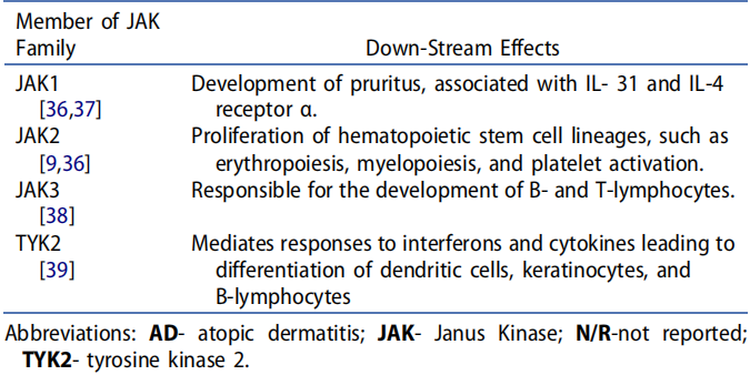 JAK-STAT信号转导通路介导许多炎症过程,抑制该通路可潜在地治疗AD。JAK1与IL-31和IL-4r α有关,负责瘙痒症的发展(表2)。JAK2负责造血干细胞谱系的增殖,如红细胞生成、骨髓生成和血小板活化。JAK3由淋巴细胞表达,并负责这些细胞的发育。TYK2介导对干扰素和细胞因子的反应,导致树突状细胞、角质形成细胞和B淋巴细胞的分化。
