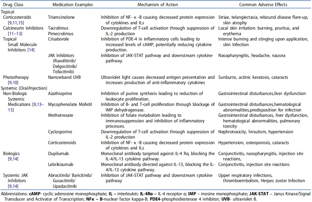 局部钙调磷酸酶抑制剂、局部皮质类固醇或局部crisaborole联合治疗可用于中度或复发性AD。虽然局部药物用于局部疾病,但光疗适用于广泛的疾病,需要进行风险-获益分析,以评估治疗的益处与长期副作用(包括潜在的致癌过程的诱导)的对比。严重疾病或复发性耀斑对局部治疗难以耐受,需要开始全身治疗,包括口服抗炎药和生物制剂。