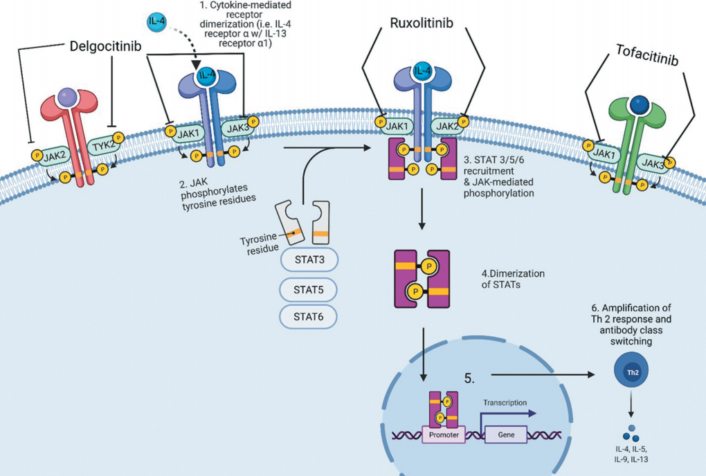 AD发生的主要细胞因子包括IL-4和IL-13。IL-4和IL-13负责抗体类别转换和放大Th 2反应,导致额外的促炎细胞因子的释放,进一步促进角化细胞功能障碍。IL-4和IL-13均通过IL-4Rα介导其联合Th2效应。JAK1和JAK3进一步促进IL-4应答,进而导致STAT3、STAT5和STAT6的磷酸化。