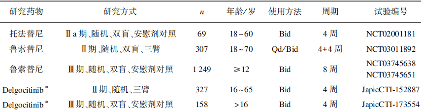 Delgocitinib(JET-052):JTE-052软膏外用的多中心随机对照试验中327名中重度AD 患者随机按2:2 :2 :2 :1 :1比例分为6组分别接受0.25%、0.5%、1%和3% JTE-052软膏安慰剂及0.1%他克莫司软膏治疗,每天2次外用。试验结束时JTE-052软膏组EASI下降百分比分别为41.7%、57.1%、54.9%、72.9%,与安慰剂组下降12.2%相比具有统计学意义,与0.1%他克莫司组(62%)无明显差别。NRS评分在使用第1天夜间即有降低,并在此后稳定维持。0.5% Delgocitinib的临床试验中,共158名中重度AD患者按2:1比例随机分配至0.5% Delgocitinib软膏组和安慰剂组,每天2次外用。治疗组EASI评分下降44.3%,而安慰剂组上升1.7%,两者差异具有显著统计学意义,NRS评分结果与I期试验一致。
