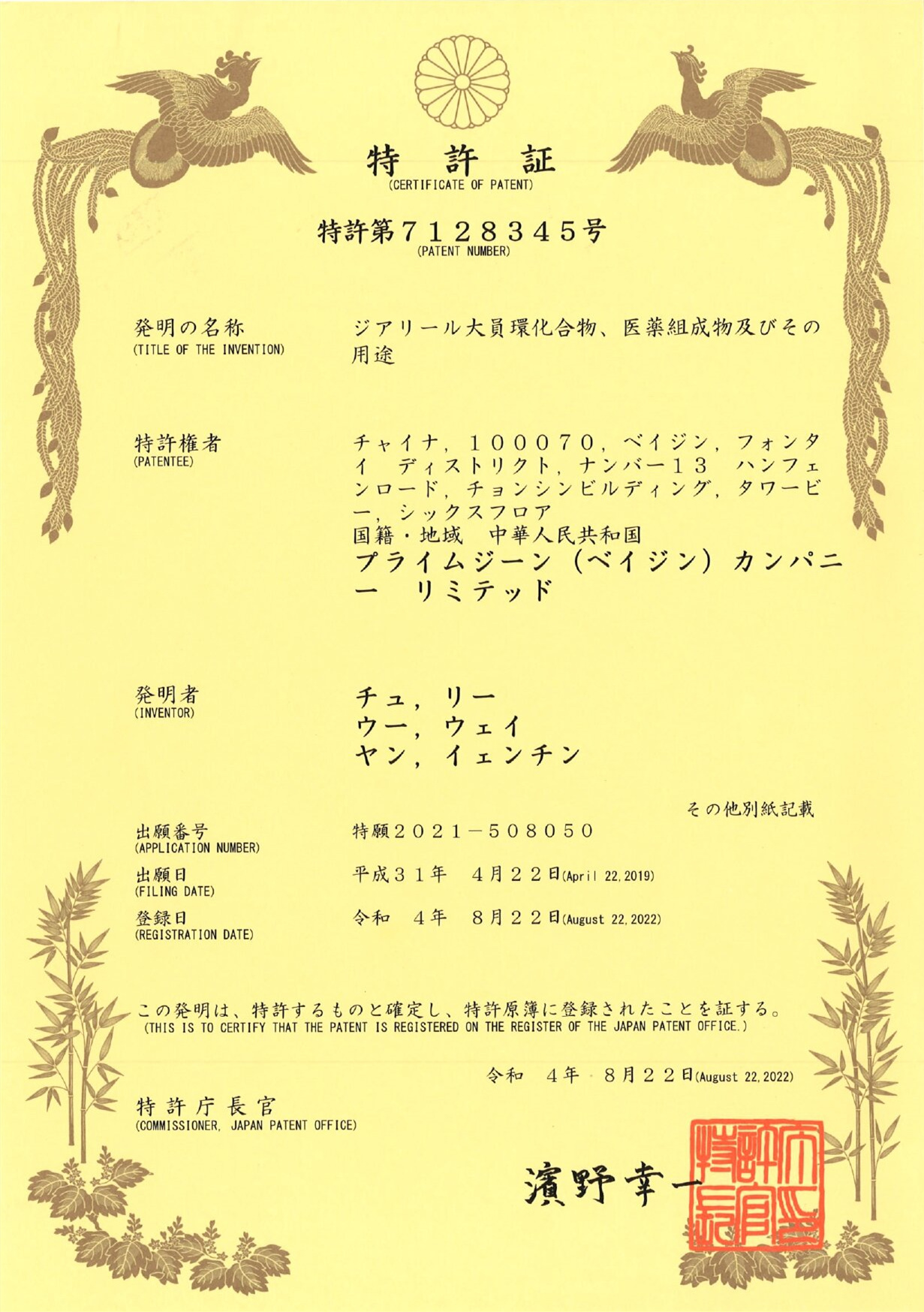 近日,普祺医药自主研发的“一种JAK抑制剂的化合物前药及制备与应用”、“一种二芳基巨环化合物、药物组合物以及其用途”两项发明专利分别成功获得国家知识产权局和日本专利局授权,并取得发明专利证书。这是普祺医药在生物医药领域创新上取得的又一突破,标志着普祺医药的产品管线进一步丰富,新药研发工作又跃上了一个新台阶。